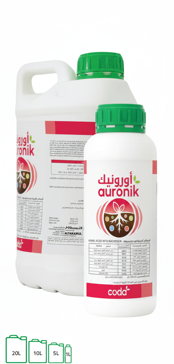 محفز حيوي مع الماغنسيوم يحتوي على نسبة جيدة من الأحماض الأمينية الحرة نباتية المنشأ المتحللة إنزيمياً مع نيتروجين مرتبط مع كمية كبيرة من المواد العضوية يحفز الوظائف الفسيولوجية للنبات يدعم النمو المثالي للثمار وزيادة مقاومة النباتات لظروف الإجهاد أورونيك المغنيسيوم الموجود في تركيبته، وبتآزره مع الأحماض الأمينية، ويُنشّط الكائنات الدقيقة المفيدة في التربة. كما يُعزز التآزر بين المغنيسيوم والأحماض الأمينية تكوين السكريات والنشويات وانتقالها إلى الفاكهة. أورونيك يوفر كمية كبيرة من المركبات العضوية (الأحماض الأمينية، والأحماض العضوية، والسكريات منخفضة التعدد)، والتي تُحسّن، عند دمجها مع المغنيسيوم، بنية التربة الزراعية وتزيد من استيعاب وامتصاص العناصر الغذائية، مما يزيد من جودة وإنتاجية المحاصيل